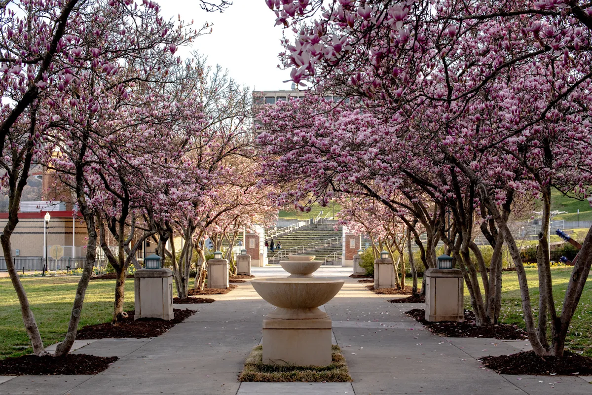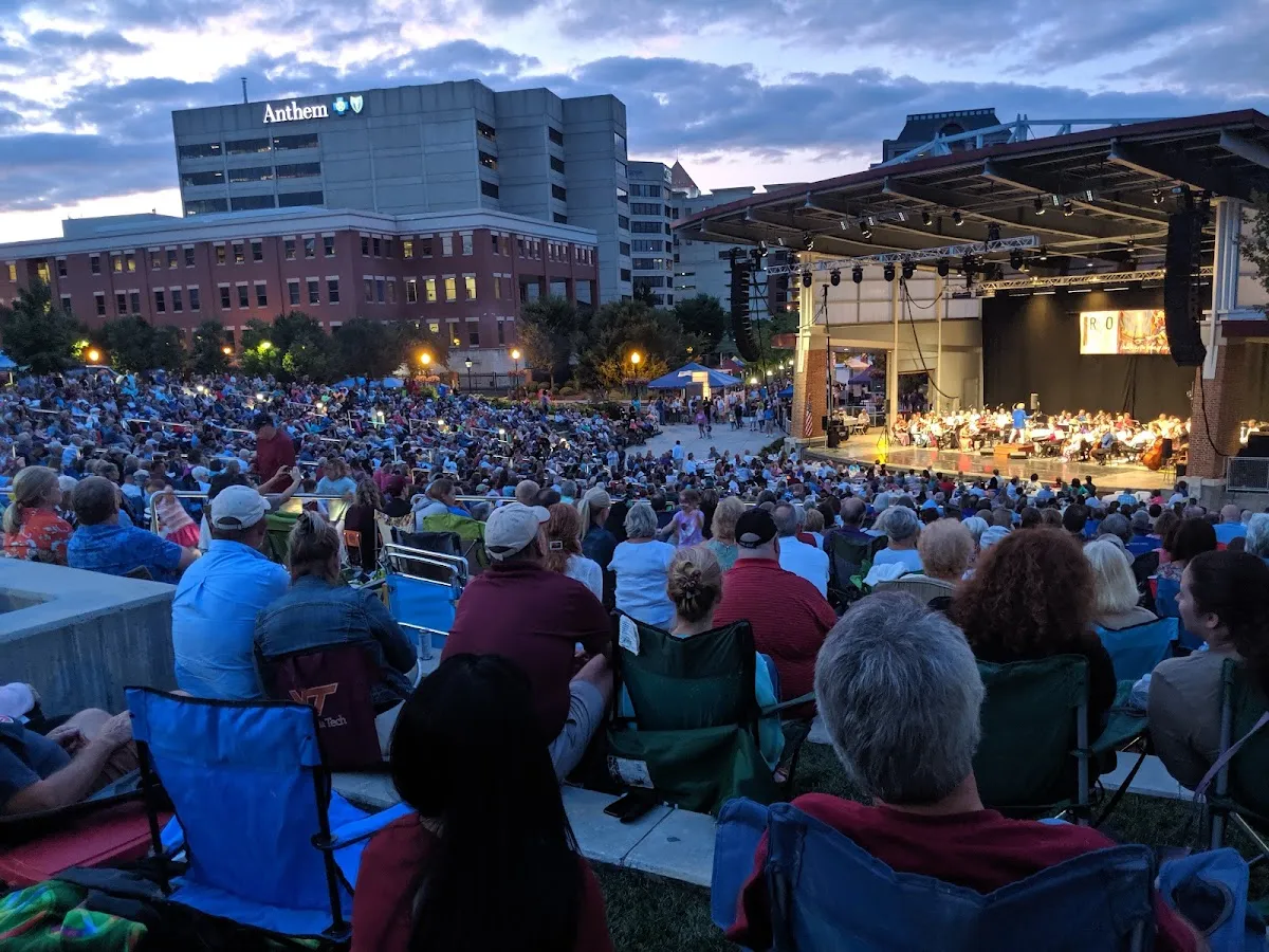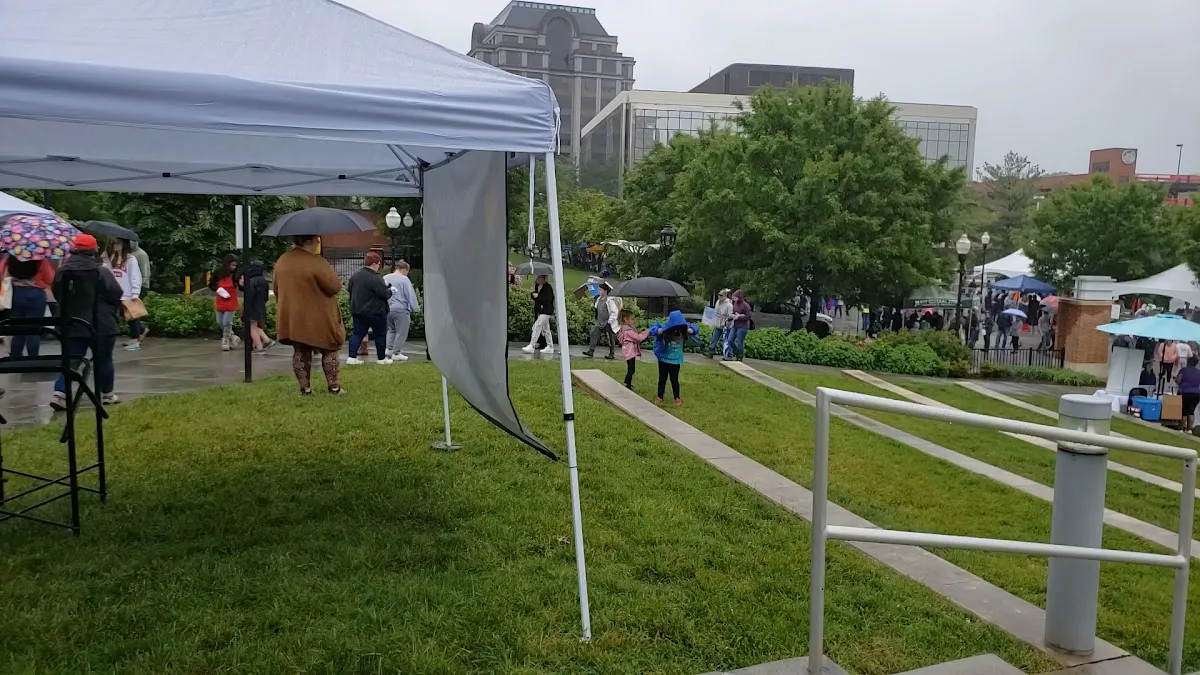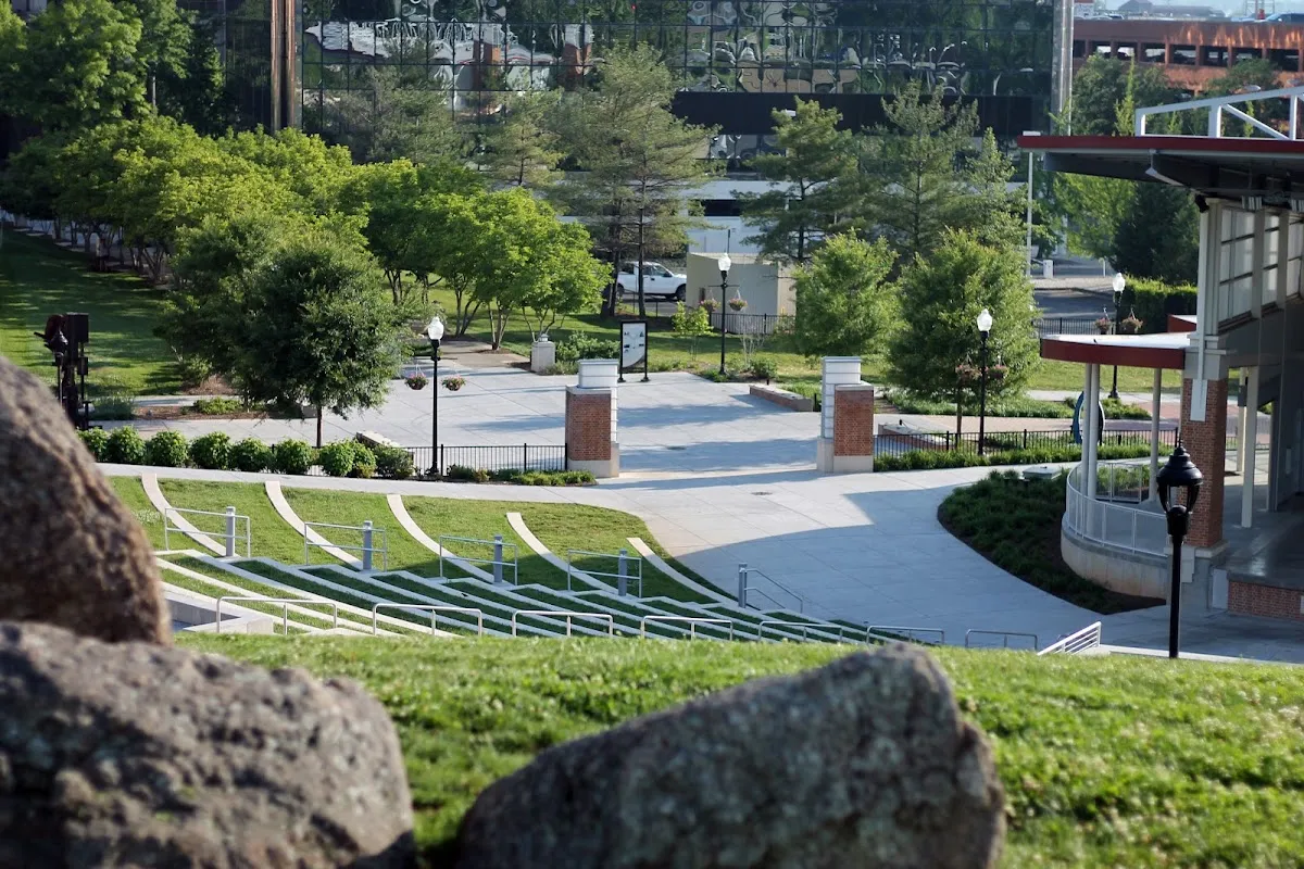 Park with play areas, fountains & an amphitheater, plus occasional festivals & community events.